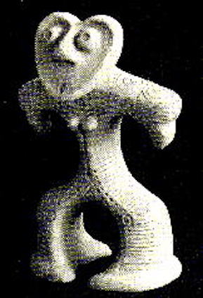 Fig. 8A10) Scultura litica antropomorfa (disegno). Raffigura una donna. La deformazione stilistica è di tipo geometrico. È un idolo che si può equiparare alle veneri paleolitiche e alle dee madri più recenti. L'unico attributo femminile che queste sculture hanno sono i seni, questo non riguarda affatto lo stile dell'arte, ma una filosofia religiosa. La Dea dei serpenti di Cnosso è completamente vestita ed ha i seni in mostra.