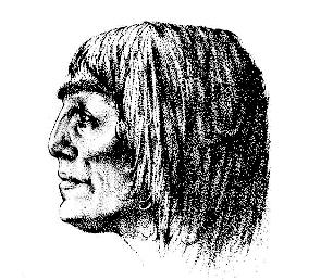 Fig. 3.8)Graphic simulation of two parts of the same skull of Homo sapiens neanderthalensis (from La Chapelle-aux-Saints). To the left is the front view, to the right a profile view. (Drawing by P. Gaietto, 1982.)